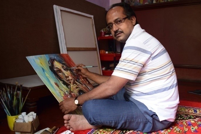 Srimanta Das is a young aspiring artist who specializes in face paintingswhich are steeped in photo-realism. His face paintings convey many moods and many stories. One can feel the inner persona vividly etched in the outer visual self of his faces. His palette is inclined towards the darker shades – stark shades of red, blue along with grey and black embroider his canvas. His favoured medium is acrylic and oil. As an expert craftsman both in oil and acrylic sometimes he exercises both in one canvas offering acrylic as background colour and oil for the object.