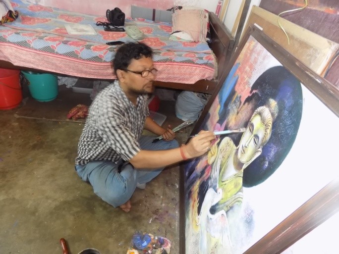 To make his painting unique, he assimilates man, nature, and peace in a single frame. His favourite colours are green, blue and red which he uses in his preoccupation with the background texture. Inspired by his contemporary artist Sanatan Dinda’s (1971-) Buddha paintings he articulates his own genre in a different dimension with the same object. Both Bikash bhattacharjee’s (1940 – 2006) subjective guts and Shahabuddin’s (1950-)powerful dynamism have great impact on him. In Europe, Leonardo Da Vinci(1452 -1519))as well as Pablo Picasso(1881 – 1973) persists as his favourites. Our gallery is adorned with some his exclusive paintings from ‘In Search of Peace’ series. The prime essence of these paintings is the representation of Buddha amidst various aspects of nature. Floral and leafy decorative texture in backdrops with white dove, white hibiscus, pink lotus are fairly associated with the differently posed Buddhas. Apart from Buddha, an Indian ‘local violin’ player occupies his mind in one of his paintings. His peaceful absorption in music is expounding in his perfect posture. The viewers can relate the serene feeling they have procured from the painting.